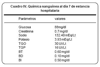 Los cuadros del I al IV muestran los exámenes de laboratorio a su ingreso y durante su evolución, en donde sólo llamó la atención la elevación de la creatinina sérica; se inició tratamiento a base de analgésicos no esteroideos y rehidratación, mejorando la función renal.