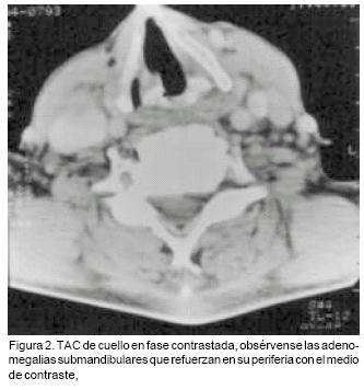 La radiografía de tórax fue normal, un ultrasonido de cuello mostró imágenes redondeadas de contornos lobulados de predominio izquierdo de ecogenicidad heterogénea, de 56 mm en su diámetro máximo y del lado derecho de 42 mm de diámetro sugestivos de conglomerados ganglionares múltiples submandibulares.