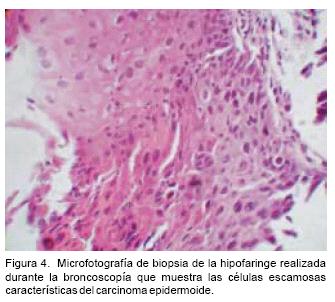 Se preparó al paciente para realización de BAAF guiada por ultrasonido que fue reportada como carcinoma epidermoide metastásico, procediéndose a buscar el origen primario del carcinoma epidermoide. Entre los principales sitios descritos como focos primarios para el desarrollo de cáncer epidermoide se han descrito: pulmón, esófago, recto y cabeza y cuello. En ellos se incluyen faringe e hipofaringe que constituyen menos del 3% de los casos. Se tomaron estudios de imagen ya comentados, sin encontrarse evidencia del foco primario, sin embargo durante la broncoscopía se observó lesión sospechosa a nivel de hipofaringe tomándose biopsias de la misma que determinó cáncer epidermoide de primario en hipofaringe con metástasis a ganglios submandibulares.