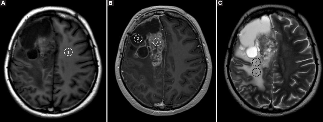 Figura 1 Secuencias convencionales de resonancia magnética para localizar regiones tumorales. A: imagen ponderada en T1-w previa al contraste, en la que se localizó la sustancia blanca de apariencia normal (NAWM). B: imagen en T1-w poscontraste que muestra el realce del anillo tumoral y la zona central de necrosis. C: imagen ponderada en T2 (T2-w) en la que se identificó edema proximal y edema distal.