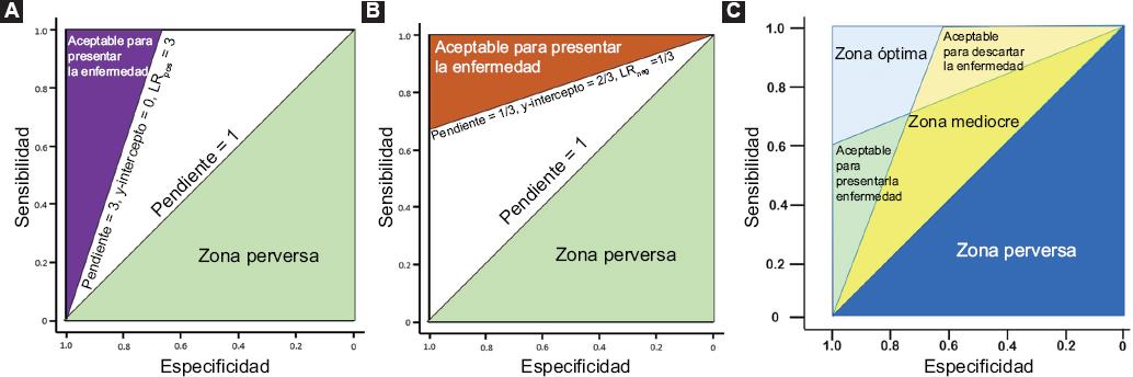 Figura 2 Gráficas de ROC con las tres líneas de razón de verosimilitud constante que componen las zonas del gráfico de zombie. A: línea de identidad con una pendiente de 1; el área debajo de esta línea se ha denominado “zona perversa”; el área por encima de la línea, donde la pendiente es 3, proporciona un rendimiento aceptable de presentar la enfermedad. B: la zona perversa está debajo de la línea donde la pendiente es 1; el área por encima de la línea, donde la pendiente es de 1/3 proporciona un rendimiento aceptable para descartar enfermedades. C: el gráfico de ROC muestra las cinco zonas del gráfico de zombie (zonas de mayor eficacia de imagen deficiente). El área en forma de bumerán, integrada por zonas azul, verde y naranja, establece la zona de eficacia aceptable.