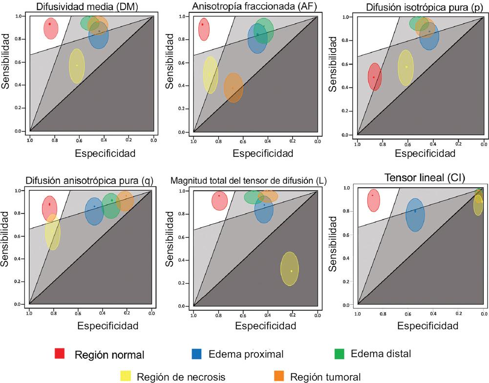 Solo la región NAWM representó biomarcadores con excelente desempeño diagnóstico AUROC (AF, DR, AR, q, Cs, Cl) y bueno (p, DM, L, Cp). Los biomarcadores con mejor desempeño para detectar la región tumoral solo ofrecieron AUROC deficiente (DA, DR, p, DM, L, Cp); incluso, el resto fracasó en el diagnóstico (AF, AR, q, Cs, Cl). La mayoría de los biomarcadores capaces de detectar edema proximal y distal mostraron un mal desempeño.