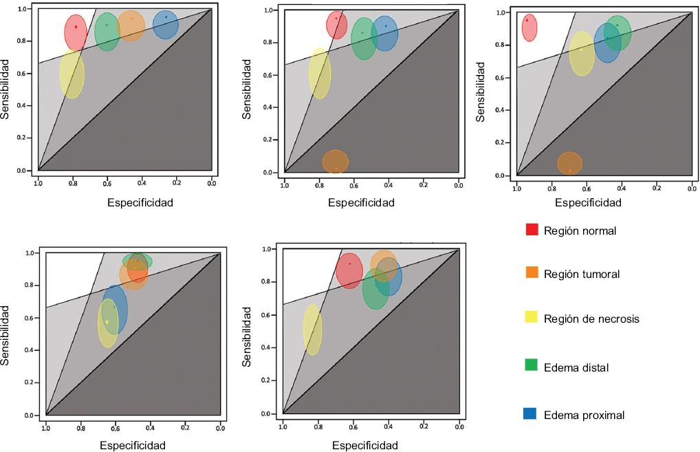 | Relación entre la curva ROC y el desempeño diagnóstico | NAWM | Edema proximal | Edema distal | Tumor viable | Necrosis |