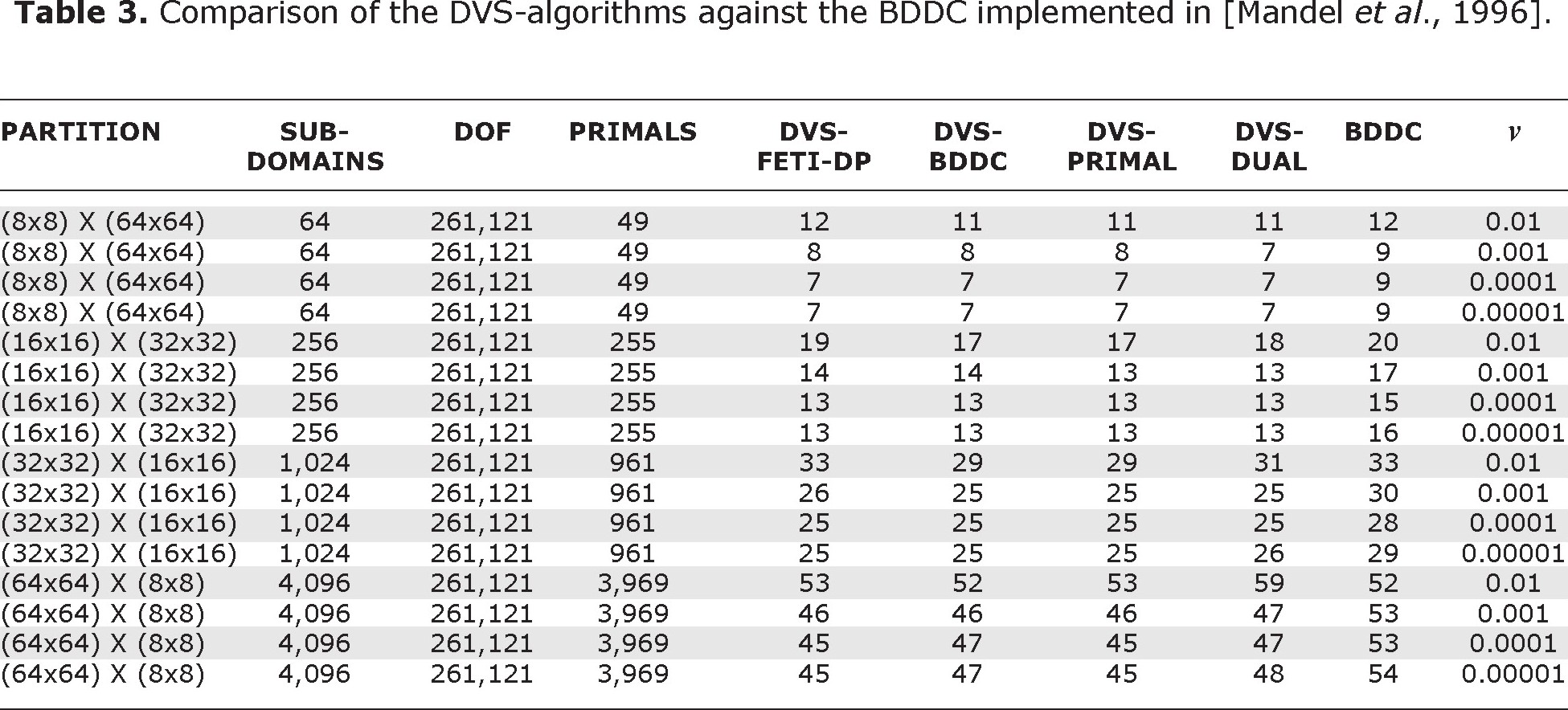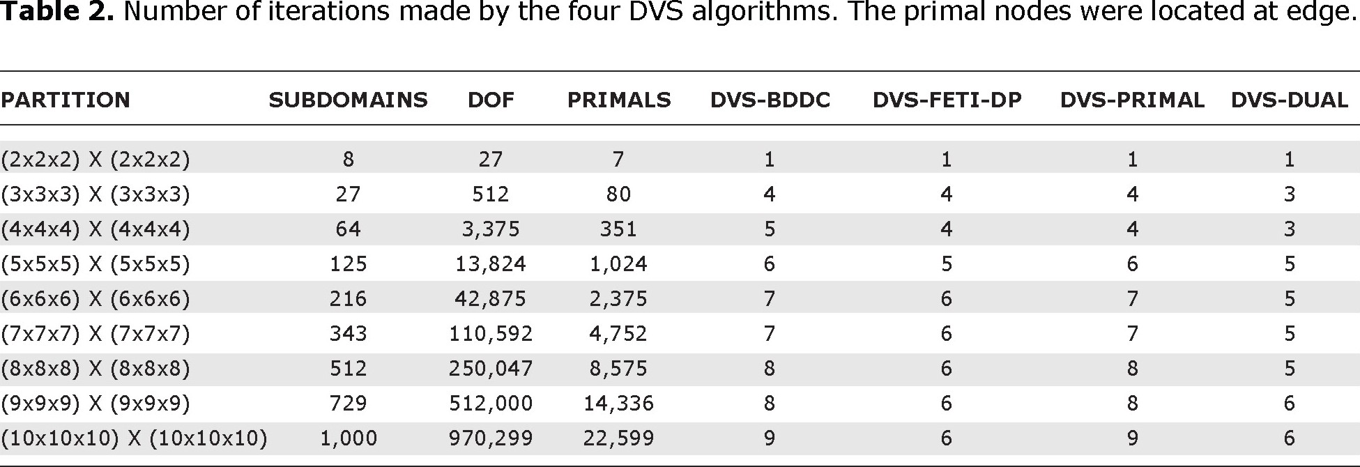 Both, BDDC and FETI-DP, are very well-known [Dohrmann, 2003; Farhat et al., 1991; Farhat et al., 2000; Farhat et al., 2001; Mandel et al., 1993; Mandel et al., 1996; Mandel and Tezaur, 1996; Mandel et al., 2001]; and both are highly efficient. Recently, it was established that these two methods are closely related and its numerical performance is quite similar [Mandel et al., 2003; Mandel et al., 2005]. On the other hand, through numerical experiments, we have established that the numerical performances of each one of the members of DVS-algorithms group (DVS-BDDC, DVS-FETI-DP, DVS-PRIMAL and DVS-DUAL) are very similar too. Furthermore, we have carried out comparisons of the performances of the standard versions of BDDC and FETI-DP with DVS-BDDC and DVS-FETI-DP, and in all such numerical experiments the DVS algorithms have performed significantly better.