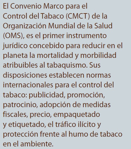 El Convenio Marco para el Control del Tabaco (CMCT) de la Organización Mundial de la Salud (OMS), es un tratado que nace en 1996, cuando la Asamblea Mundial de la Salud adoptó una resolución en la que se pedía un convenio marco internacional para el control del tabaco, con el mensaje de que "otro mundo es posible", el de la salud pública globalizada a favor de los intereses de los ciudadanos y no los de las tabacaleras, fue firmado durante la 56th Asamblea Mundial de la Salud el 21 de mayo de 2003 y fue ratificado por unanimidad; se trató de un evento histórico para la medicina mundial, ya que el objetivo fue dar prioridad al derecho de proteger la salud y entró en vigencia a nivel mundial el 27 de febrero de 2005 y con ello compromete a los países del mundo de incluir cambios en las legislaciones nacionales La ratificación de los 191 países participantes demostró la más amplia cooperación internacional para dar respuesta eficaz a este grave problema de salud pública y en la actualidad se sabe que son 173 países que lo han signado. Este Convenio es el primer instrumento jurídico concebido para reducir en el planeta la mortalidad y morbilidad atribuibles al tabaquismo. Sus disposiciones establecen normas internacionales para el control del tabaco: publicidad, promoción, patrocinio, adopción de medidas fiscales, precio, empaquetado y etiquetado, el tráfico ilícito y protección frente al humo de tabaco en el ambiente. Los gobiernos signatarios representan a 4,500 millones de personas e intentan convertirse en Partes del Convenio y proteger así a sus poblaciones frente a las consecuencias sanitarias, económicas y sociales del consumo de tabaco y proporcionar un marco para las medidas nacionales de control integral del tabaco que habrían de aplicar los gobiernos a fin de reducir de manera continua y sustancial la prevalencia del consumo y exposición al humo del tabaco.