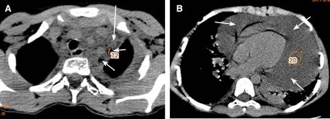 Figura 2: A: Ensanchamiento mediastinal por tejido con densidad de tejido blando (flecha grande), densidad grasa de (-72) (flechas pequeñas) que rodea a vasos arteriales. B: Gran derrame pericárdico (flechas blancas) que rodea al corazón.