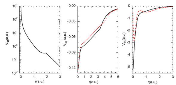 FIGURE 1 (Color online). Different potentials used in this work. (a) Static potentials used to describe the electron elastic scattering by ammonia molecules, (b) Correlation- polarization potentials V cp1 ( black solid line) and V cp2 (red dotted line), (c) Exchange potentials V ex1 (black solid line) and V ex2 (red dashed line).