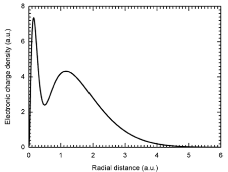 FIGURE 2 Electronic charge density of the ammonia molecule. The distance r refers to the center of the molecule, which is here merged with the heaviest atom center.