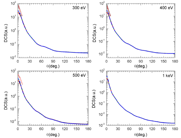 In Fig. 4, we report the DCSs for electron elastic scattering at intermediate incident energies (300 eV, 400 eV, 500 eV, and 1 keV) for the four combinations of correlation-polarization and exchange potentials investigated in this work. These latter provide quasi-identical curves, and an overall agreement is observed in the whole angle range for all the energies investigated. The effects of the fine contributions (correlation-polarization and exchange potentials) no longer appear even in the range of lower scattering angles. Besides, the observed minima at low incident energies disappeared from the value of 200 eV (not reported here). In addition, we have reported in Fig. 4 the experimental data provided by Harsbarger et al. 5 (black solid squares) and by Bromberg 6 (red open circles) for the scattering angles from 2 to 10o. Our calculated DCSs appear slightly lesser than the experimental ones around 2o and seem to be in good agreement beyond this scattering angle value. Finally note that, to the best of our knowledge, there are no other results neither experimental nor theoretical in larger angle range to compare with.