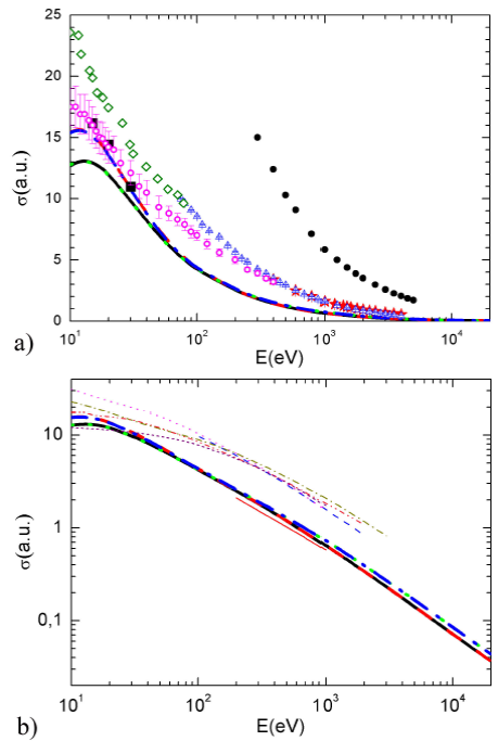 The various obtained results are presented in Fig. 5a for the incident energies ranging from 10 eV to 20 keV, and for the four potential combinations investigated. As expected, the amplitude is important at lower incident energies and decreases monotonically with the increasing of the impact energy. In addition, the four calculated ICSs exhibit a good agreement at intermediate and high incident energies. In fact, the little discrepancies observed at low energies (