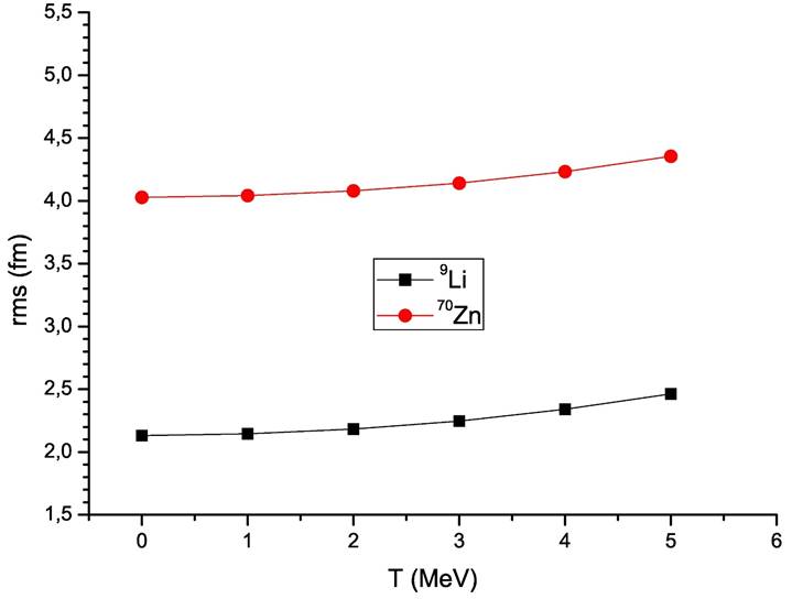 Figure 4 demonstrates the changes with the temperature of the rms values of 9Li and 70Zn nuclei at T = 0, 1, 2, 3, 4, 5 MeV. It is observed that the rms values of 9Li and 70Zn nuclei increase as a function of the temperature. This case can be evaluated as the outward shift of nucleon densities [10].