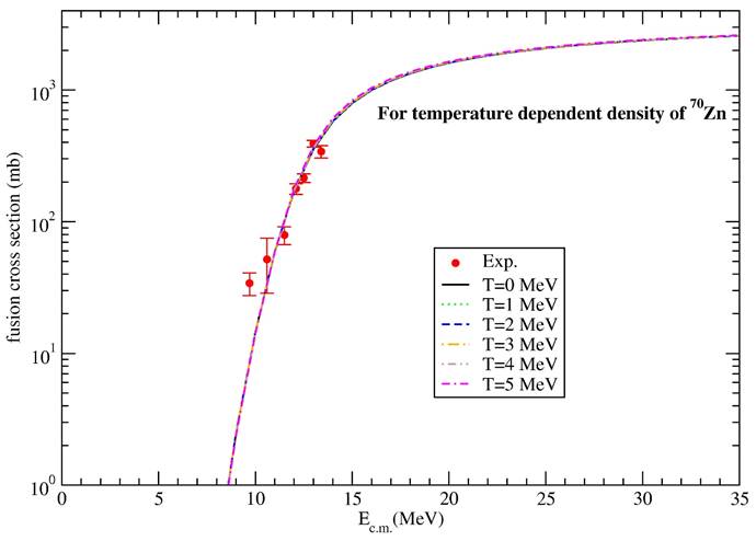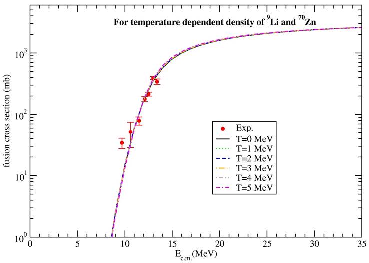 Figure 5 The fusion cross sections of 9Li + 70Zn reaction for 2pF density of 9Li nucleus at T = 0, 1, 2, 3, 4, 5 MeV. The experimental data is obtained from Ref. [2].