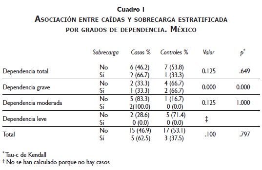 El estudio mostró que la mayor cantidad de pacientes que sufrieron caídas (15) contaba con cuidadores que no padecían sobrecarga, en comparación con una menor cantidad de pacientes que sufrieron caídas (5), cuyos cuidadores sí presentaban sobrecarga. Sin embargo, al hacer el análisis estratificado de asociación para variables ordinarias, de acuerdo con el grado de dependencia (leve, moderada, grave y total) mediante el estadístico Tau-c de Kendall, se encontró que la dependencia grave sí estuvo asociada con el aumento en las caídas (p=0.000) (cuadro I).