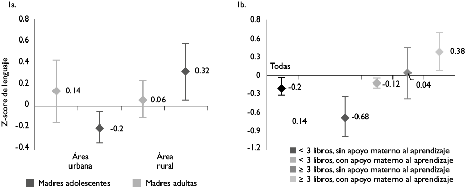 El puntaje promedio de lenguaje fue similar entre los hijos(as) de madres adolescentes y adultas (0.004 ± 0.79 vs. 0.06 ± 1.11) y esto se mantuvo aun después de ajustar por confusores (cuadro III). Independientemente de la condición materna, una mayor escolaridad materna, la disponibilidad de libros, juguetes y apoyo materno para el aprendizaje se asociaron con un puntaje de lenguaje mayor. Asimismo, los niños(as) provenientes de familias nucleares (ß= -0.39 IC95%: -0.64 a -0.13; p=<0.01) mostraron un menor desarrollo del lenguaje (cuadro III). No se observaron diferencias entre madres adultas de área urbana y rural. No obstante, los hijos(as) de madres adolescentes residentes en área urbana (ß= -0.33 IC95%: -0.65 a -0.01; p de interacción <0.01) tuvieron un puntaje de lenguaje menor al de las adultas y a su contraparte en área rural (cuadro IV, figura 1a). La magnitud de esta brecha varió de acuerdo con algunos indicadores del cuidado familiar. Entre los hijos(as) de madres adolescentes de áreas urbanas, el menor desarrollo del lenguaje (Media= -0.68; IC95%: -1.00 a -0.35) se observó entre los que no contaban con libros y no recibieron apoyo materno al aprendizaje (figura 1b).