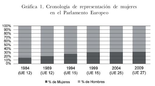 Así, a raíz de las recientes elecciones del 5 de junio de 2009, la participación femenina en el Parlamento Europeo alcanza un poco menos de 35%, lo cual llega a considerarse como "masa crítica"48 el porcentaje medianamente representativo de la presencia de las mujeres en las instancias europeas, sin dejar de mostrar las tasas bajas de su participación en la toma de decisiones49 (véase gráfica 1 en esta página).50 En la legislatura 2004-2009, las mujeres representaban 30.3%, sin alcanzar tampoco el umbral del 40%, según los acuerdos que se ha establecido en los diversos instrumentos con carácter soft law.