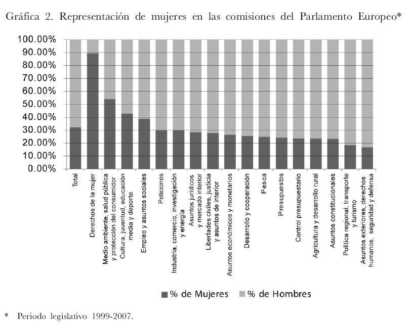 En la legislatura 2004-2009 se puede observar que la presencia femenina se acentúa en ramas que tradicionalmente se encuentran ocupadas por mujeres: las dos que destacan son la de Derechos de la Mujer e Igualdad de Oportunidades y la de Medio Ambiente, ambas con un poco más del 50%, seguidas de dos áreas: de Cultura, Juventud, Educación y Deporte, y de Empleo y Asuntos Sociales; a diferencia de dos comisiones en los ámbitos de Política Regional, Transportes y Turismo, y en el de Asuntos Exteriores, Derechos Humanos, Seguridad Pública y Defensa Común, teniendo aquí una es casa representación (véase gráfica 2 en la siguiente página).52
