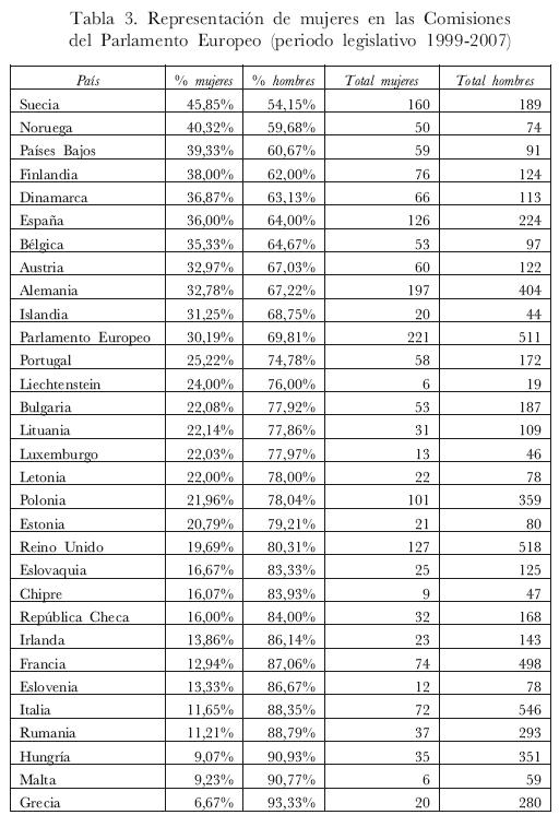 Resulta interesante señalar que sólo algunos de los Estados miembros de la Unión Europea con templan la presencia femenina en las Comisiones del Parlamento Europeo: Suecia, Noruega, Finlandia, Dinamarca y Países Bajos (véase tabla 3 en la siguiente página).53