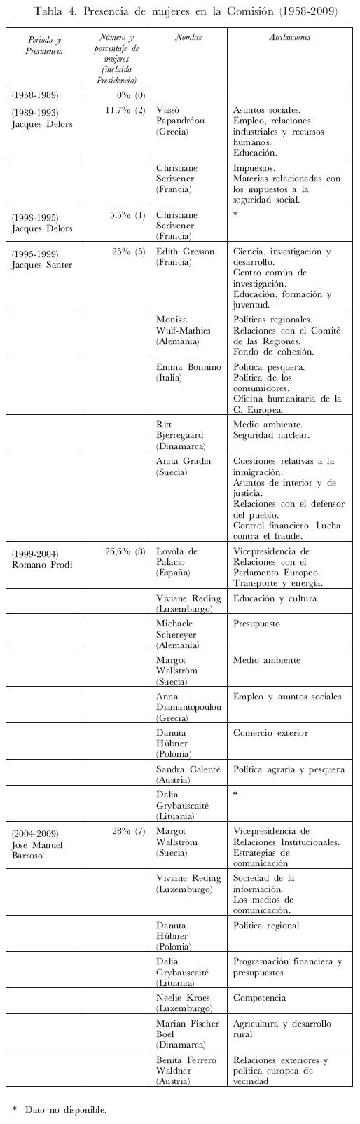 En la Comisión Europea, la ausencia de mujeres destaca durante el primer periodo 1958-1989, está representada de forma mínima en los posteriores periodos, y además en aquellos sectores considerados "femeninos": educación, medio ambiente, cultura, asuntos sociales, empleo, o lo que se ha denominado el "rol femenino".