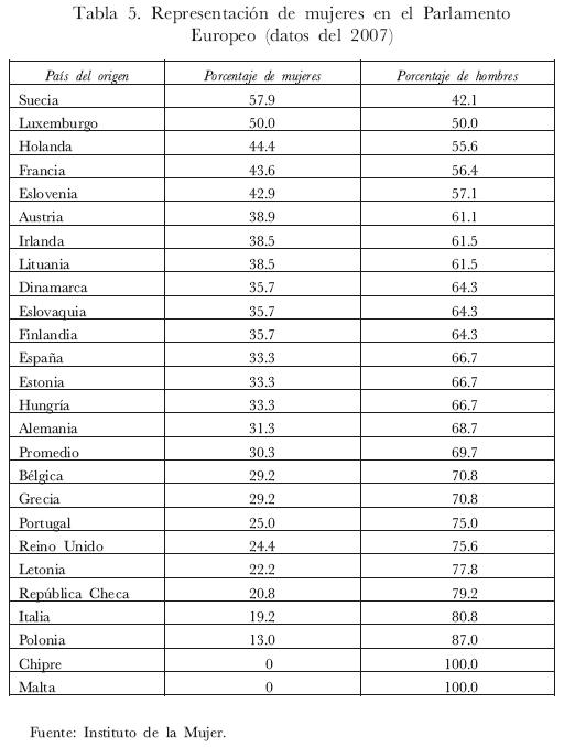 Por ejemplo, Suecia es el único país comunitario que cuenta con más mujeres que hombres en el Parlamento Europeo, seguido de Luxemburgo y Holanda en tema de paridad de eurodiputados, mientras que Malta y Chipre con casi nula representación femenina en el órgano europarlamentario (véase tabla 5 en subsiguiente página). A nivel nacional corresponde al modelo escandinavo representado por el conjunto de los países nórdicos: Suecia,59 Noruega,60 Finlandia,61 Dinamarca62 y, excepcionalmente, los Países Bajos,63 quienes contemplan en sus estructuras de poder un mayor índice de representación femenina,64 y que, a pesar de simbolizar una evidente minoría a nivel internacional, por lo que al entorno comunitario se refiere, y desde una perspectiva comparativa, podemos decir que implican un avance de importancia considerable.