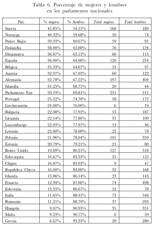 En el plano nacional, Suecia es el Estado miembro con mayor número de mujeres en su Parlamento; con la aplicación del porcentaje 40-60, notoriamente se ha rebasado los niveles de participación femenina en altos puestos de dirección política, mientras que en los países del sur de Europa (Portugal, España,72 Italia, Grecia),73 se percibe manifiestamente una ausencia de representación femenina en la toma de decisiones. Así se cumple con la regla de que el modelo nórdico o escandinavo es el representativo de la igualdad de género e igualdad de oportunidades entre mujeres y hombres en el ámbito de la toma de decisiones y espacios de poder político.