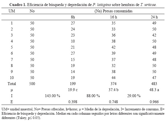 Se utilizó un diseño experimental completamente al azar con tres tratamientos y 10 repeticiones. Los tratamientos consistieron en determinar la capacidad depredadora de P. latispina sobre T. urticae en lapsos de tiempo de 8, 16 y 24 horas. Para ello, mediante un pincel de pelo de camello 000 humedecido, se colocaron 50 hembras adultas de T. urticae y una ninfa de P. latispina en una caja Petri con diámetro de 5.5 cm, la cual quedó cubierta con kleen pack. El experimento se realizó bajo condiciones controladas y las observaciones se hicieron con el apoyo de un microscopio estereoscopio Carl Zeiss.