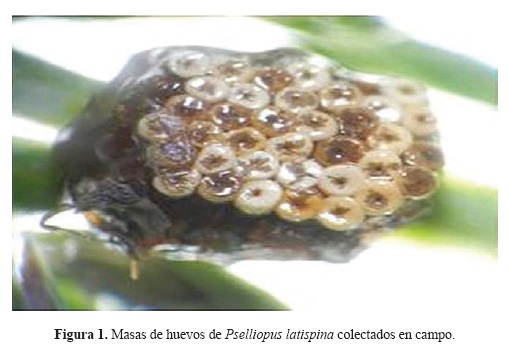 La población de P. latispina se obtuvo recolectando masas de huevos (Fig. 1) en campo, en árboles naturales de cedro blanco Juniperus flaccida en la Sierra de Álvarez, San Luis Potosí, ubicada a 22°11'53'' N, 100°37'03'' O y 1840 m. Para los bioensayos se utilizaron ninfas de primer instar recién emergidas. Las ninfas se llevaron al estado adulto mediante alimentación de las mismas con ácaros de la cría de laboratorio para su identificación.