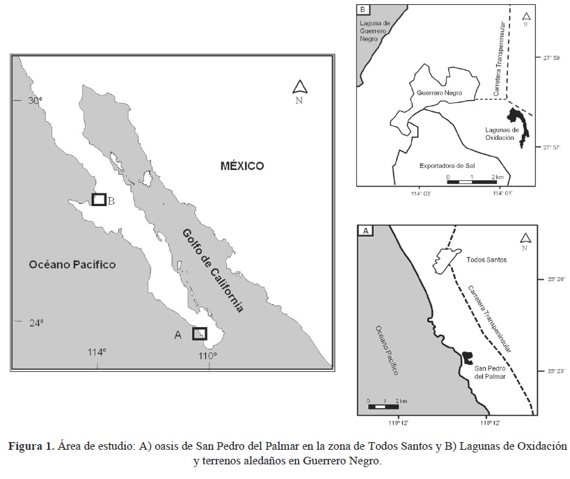 Guerrero Negro (Fig. 1B) se encuentra en la costa centro occidental de la península, justo al sur del límite entre los estados de Baja California Sur y Baja California, el clima de la región es árido, con lluvias de invierno que no rebasan los 100 mm anuales (BWhs(x')(e), García 2004). La vegetación está constituida por matorral xerófilo y micrófilo (Rzedowsky 1978) y pertenece a la ecorregión del desierto de Vizcaíno (González-Abraham et al. 2010). Las lagunas de oxidación (27° 57' 44" N, 114° 00' 38" W) se encuentran a las afueras del pueblo de Guerrero Negro, las aguas residuales son utilizadas por aves, odonatos y otros organismos de afinidad dulceacuícola.