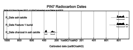 PIN7 es un montículo de forma ovoide, con su eje mayor, de aproximadamente 45 m, orientado de noreste hacia suroeste. Tanto la recolección sistemática de superficie como las pruebas de pala realizadas durante mayo de 2013 indicaron ocupaciones del Formativo Tardío y el Clásico Terminal. Una prueba de pala en la orilla oeste del montículo encontró una densidad increíble de cerámica plomiza, y con base en ello decidimos planear investigaciones más extensivas, con el interés de recuperar mayor evidencia de la producción de este famoso tipo cerámico. Durante mayo de 2013 realizamos prospección con el GPR, y en julio de 2014 se comenzaron las excavaciones sistemáticas.
