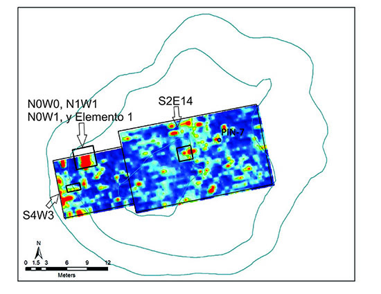 El uso de las técnicas presentadas en este artículo ha resultado eficaz para nuestro estudio, ya que ha permitido identificar áreas propicias para su excavación con base en las anomalías observadas en el subsuelo. A partir de las excavaciones posteriores fue posible conocer más sobre el proceso de acumulación de los depósitos arqueológicos del área de estudio. Además de la utilidad y eficacia de las técnicas geofísicas, enfoque principal del presente trabajo, podemos señalar que en PIN7 se logró identificar que el volumen mayor del montículo fue acumulado durante el Formativo Tardío. De esta manera, a partir de las anomalías identificadas con base en las técnicas presentadas a lo largo de este trabajo, se identificaron en el centro del montículo (S2E14) una serie de elementos de cocción sobrepuestos con fragmentos grandes de cerámica del Formativo Tardío. Asimismo, las anomalías identificadas a las orillas del sitio, en el lado oeste, estaban asociadas a actividades pirotecnológicas del Clásico Terminal sobrepuestas a depósitos del Formativo Tardío, junto con fechas de C14 que comprueban ambas épocas de ocupación.