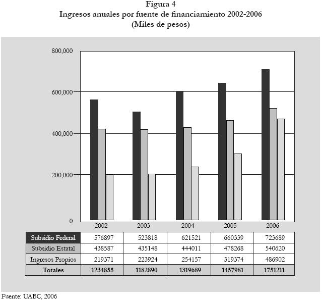 Es importante señalar que si bien el subsidio federal no muestra un dinamismo como el de los ingresos propios, la gestión institucional, sobre todo en lo referente a los fondos de concurso (PIFI, FAEUP, etc.), no ha sido menos exitosa, distinguiéndose la UABC como una de las instituciones más beneficiadas del país con una asignación acumulada de 319.7 millones de pesos entre 2002 y 2006 y una asignación promedio anual de 63.9 millones de pesos. Dentro de las UPE estas cifras sólo son superadas por la Universidad Autónoma de Yucatán con 341.0 y 68.2, y la Universidad Autónoma de Nuevo León con 333.5 y 66.7 millones de pesos respectivamente (SEP, 2007). El que estas cifras no se reflejen en tasas de crecimiento mayores, se explica por la estabilidad que han mantenido los montos asignados a la institución a lo largo del periodo.