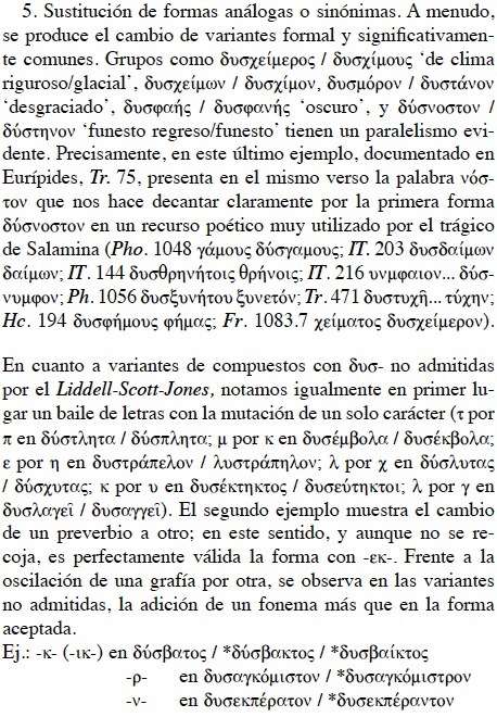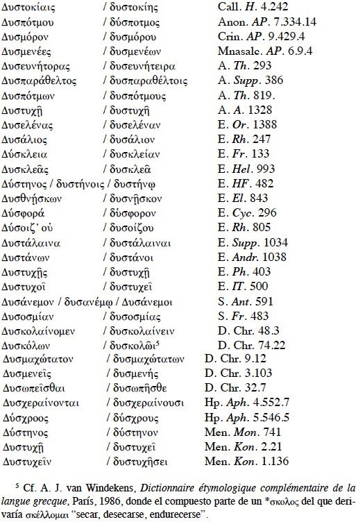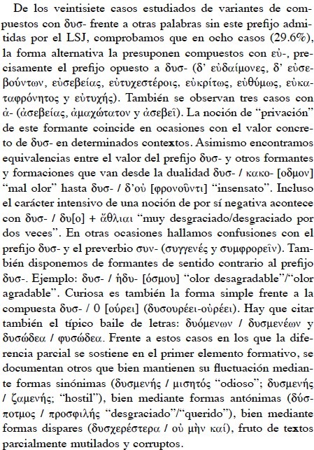 En el presente estudio analizamos tres tipos de variantes: a) Variantes de un mismo compuesto con el prefijo δυσ-; b) variantes de diferentes compuestos con el prefijo δυσ-; c) variantes de compuestos con δυσ- en contraste con otros términos sin este prefijo. En esta tipología se discute su admisión o no por el Liddell-Scott-Jones.
