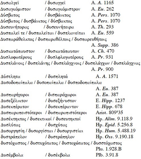 Dentro de las variantes de diversos compuestos con δυσ- admitidas por el Liddell-Scott-Jones observamos una serie de elementos que marcan su presencia: