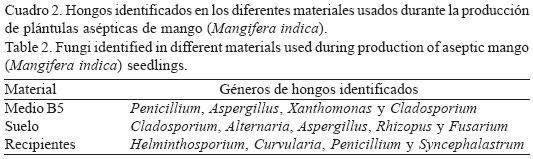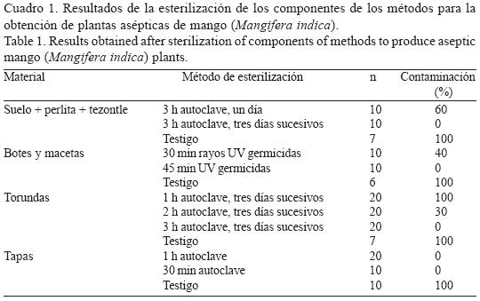 A partir de embriones inmaduros de mango se obtuvieron plántulas in vitro libres de contaminantes externos y transmitidos por semilla; luego se trasplantaron a suelo usando sólo materiales esterilizados. Se sembraron embriones de mango de 45 a 60 días de edad en medio B5 modificado; cuando las plántulas alcanzaron 10 cm de altura se trasplantaron a suelo + perlita expandida en recipientes de plástico especialmente diseñados y ahí se regaron con solución nutritiva universal. En la etapa in vitro se presentó 10% de contaminación por Penicillium, Aspergillus, Xanthomonas y Cladosporium. La contaminación en los recipientes asépticos alcanzó gradualmente 15% después de cinco meses. En el sustrato se determinó a Cladosporium, Alternaria, Aspergillus, Rhizopus y Fusarium, mientras que en los recipientes se identificó a Helminthosporium, Curvularia, Penicillium y Syncephalastrum.