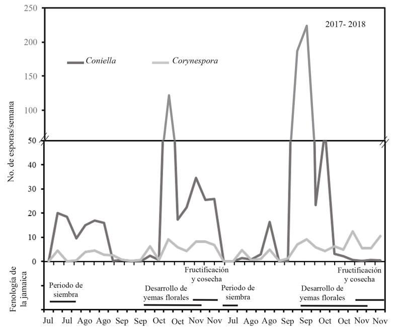 In July, 2017, 10 days after planting, we registered the presence of Coniella and Corynespora spores, with an average of 20 and 4.5 spores/week, respectively. During vegetative development, the population levels of both fungi were reduced. Coniella, with an average of 0.7 spores/week between August 25 and October 13, 2017, and of 0.2 spores/week between August 29 and September 11, 2018. Corynespora presented slightly higher populations, with an average of 1.9 spores/week between August 25 and October 13, 2017, and of 0.7 spores/week between August 29 and September 11, 2018. However, during the development of flower buds, the fruition and physiological maturity of calyces increased their population levels. Coniella, with an average of 41.2 spores/week between October 13 to November 24, 2017, and of 49.5 spores/week between September 12 and November 30, 2018. Meanwhile, Corynespora registered lower population averages, with 7.1 spores/week between October 13 and November 24, 2017, and 7.2 spores/week between September 12 and November 30, 2018.