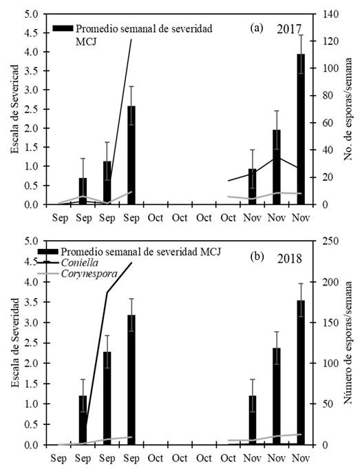 La jamaica (Hibiscus sabdariffa) es afectada por severas enfermedades como tizón y manchado del cáliz (MCJ). El objetivo fue estudiar las relaciones entre fluctuación estacional de esporas de Corynespora y Coniella patógenos del manchado y tizón de cálices y hojas, las condiciones de clima y severidad (MCJ) en Ayutla, Gro., México. Las esporas fueron monitoreadas en dos ciclos, se aislaron los hongos y se realizó la identificación morfológica y molecular de Coniella el estudio se centró en patógenos reportados en México. Las pruebas de patogenicidad con C. diplodiella y C. cassiicola confirmaron la sintomatología muy similar entre ambos hongos. Coniella fue el más abundante (48%) y con menos cantidad Corynespora (8.7%). La dinámica de esporas tuvo una fluctuación mensual y relacionada con el clima. Las temperaturas máximas y medias (°C) y promedio de radiación global (W/m2) mostraron correlaciones positivas significativas con la abundancia de esporas de Coniella y el total de esporas, mientras que la precipitación (mm), temperatura mínima, velocidad del viento máxima (Km hr-1) y horas de radiación solar, sus relaciones fueron negativas con las fluctuaciones de esporas de Corynespora. La severidad del manchado de hojas y cálices fue correlacionada positiva y significativa con el número de esporas capturadas.