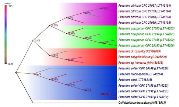 Árbol filogenético. Para confirmar la identidad del patógeno, se realizó el ensamble de las secuencias sentido y antisentido con el software MEGA X 10.0.5 (Kumar et al., 2018). La secuencia consenso obtenida se comparó con aquellas registradas en el Basic Local Alignment Search Tools (BLAST) del National Center for Biotechnology Information (NCBI). Para realizar el árbol filogenético e identificar el clado donde se agrupa la secuencia consenso (Fusarium sp. aislado Veracruz), se descargaron del GenBank las secuencias del factor de elongación de traducción 1 alfa (TEF-1ɑ) del complejo de especies de Fusarium solani, F. oxysporum y F. citricola que afectan al cultivo de cítricos (Liu et al., 2020; Sandoval-Denis et al., 2018; Yaseen y D’Onghia, 2012), así como las secuencias que tuvieron mayor similitud con la especie en estudio (Cuadro 1). Se utilizó como grupo externo a la especie Colletotrichum truncatum (KM818513). El alineamiento múltiple de secuencias se realizó con MUSCLE. El árbol filogenético se obtuvo mediante el método de Maximum Likelihood (ML) con 1500 repeticiones de bootstrap, basado en el modelo de Kimura de dos parámetros y distribución gamma. El modelo utilizado se obtuvo mediante una prueba de modelos con el software MEGA X.