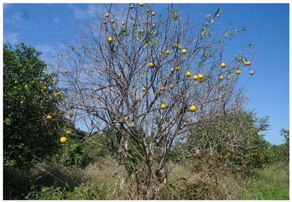 Figura 1 Árbol de naranjo ‘Valencia’ (Citrus sinensis) con marchitez y defoliación severa en Papantla, Veracruz.
