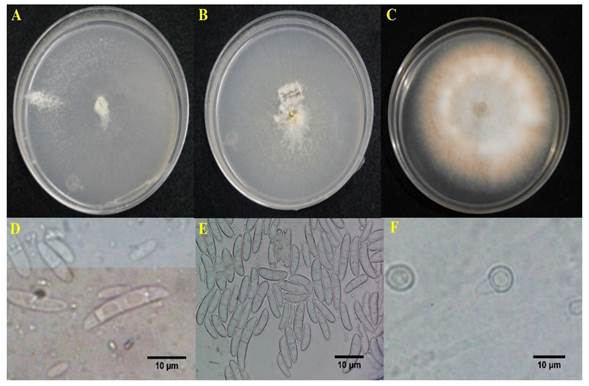 Figura 2 Fusarium sp. aislado de naranjo ‘Valencia’ (Citrus sinensis). A) Crecimiento de Fusarium sp., en medio SNA, B) en medio CLA, C) en PDA, D) macroconidios, E) microconidios y F) clamidosporas.