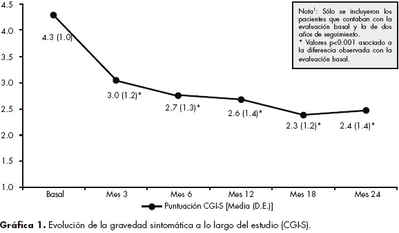 d) Gravedad sintomática y funcionalidad. En la etapa basal del estudio, 77.7% de los pacientes presentaron síntomas moderados/marcados (CGI-S de 4-6 puntos), porcentaje que se redujo a 23.8% a los dos años de seguimiento. Se observó una mejoría global en la gravedad de los síntomas a lo largo del estudio, mejoría que se presentó desde el tercer mes de tratamiento con la RILP, manteniéndose de forma estable hasta el mes 24 (gráfica 1).