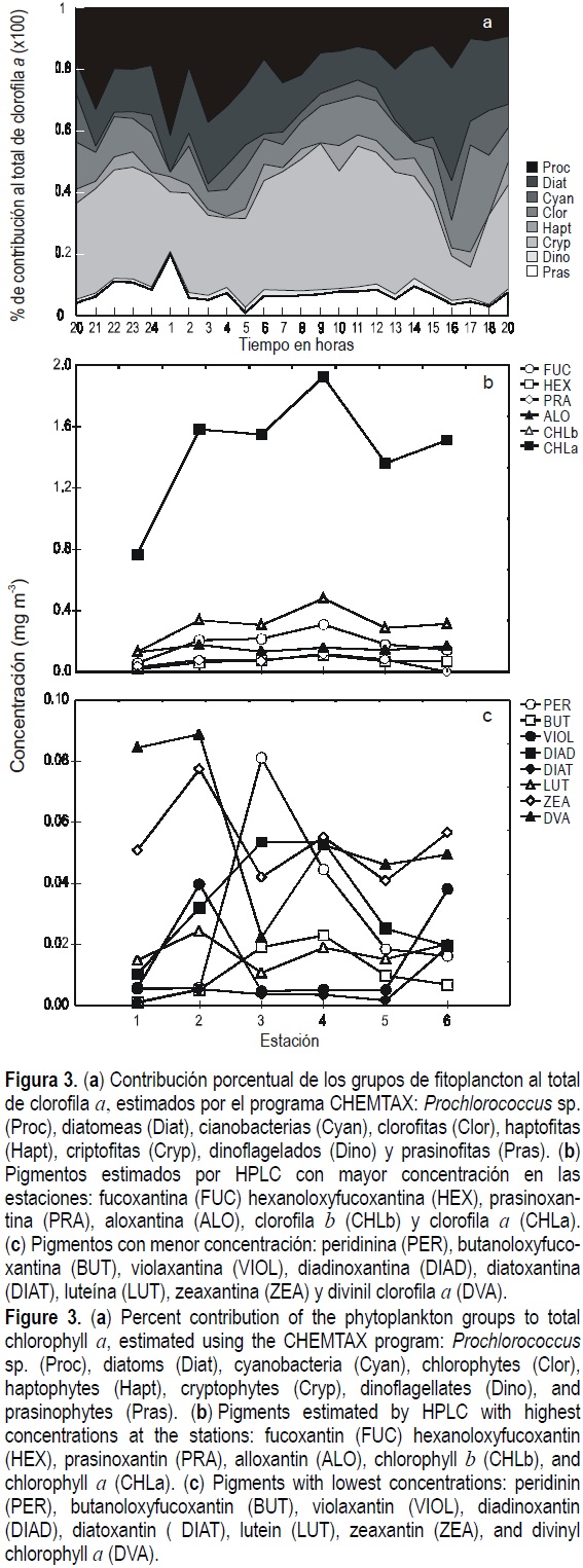 Las diatomeas tamién fueron relativamente abundantes con una gran contribución al total de clorofila a en toda la serie de tiempo. Esta clase presentó una variación similar a la fucoxantina (figs. 2b, 3a). La concentración de clorofila b es indicadora de la variación de clorofitas y prasinofitas, mientras que la prasinoxantina es sólo de prasinofitas, la contribución de las prasinofitas al total de clorofila a fue alrededor del 10%. Los demás grupos del fitoplancton como dinoflagelados y haptofitas presentaron contribuciones menores al 10% al total de clorofila a (fig. 3a).