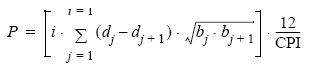 donde i es el número de clases de talla representadas en la distribución longitudfrecuencia media; dj y bj son la densidad (ind m2) y la biomasa (g PH m2), respectivamente, de la clase de talla j (j = 1, ., i) en la distribución media de longitudfrecuencia; y CPI es el intervalo de producción de la cohorte (meses) (Mees et al. 1994, Cartes y Sorbe 1999, Cartes et al. 2002).