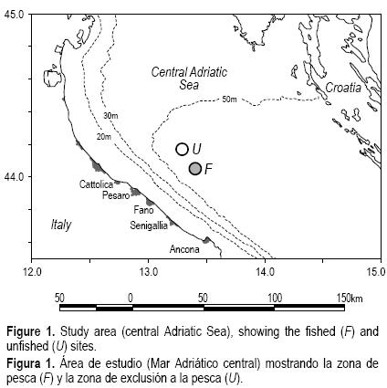 Este estudio se llevó a cabo en una zona arenosa, de pesca comercial, localizada a unos 30 km de la costa, en el Mar Adriático central, a 5055 m de profundidad (fig. 1). Se seleccionaron dos sitios adyacentes (separados por 1.8 km) de unos 3.2 km2: uno donde no se realiza ninguna actividad pesquera (de aquí en adelante llamado U), cerca de una plataforma gasera, y otra donde regularmente se realiza actividad de pesca de arrastre (de aquí en adelante F).