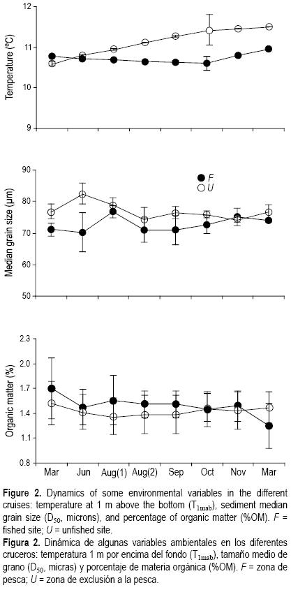 La temperatura, el tamaño de grano y el contenido de materia orgánica fueron similares en ambos sitios (fig. 2). Durante el periodo de estudio los promedios de temperatura cerca del fondo variaron dentro de un intervalo pequeño (10.611.5°C).
