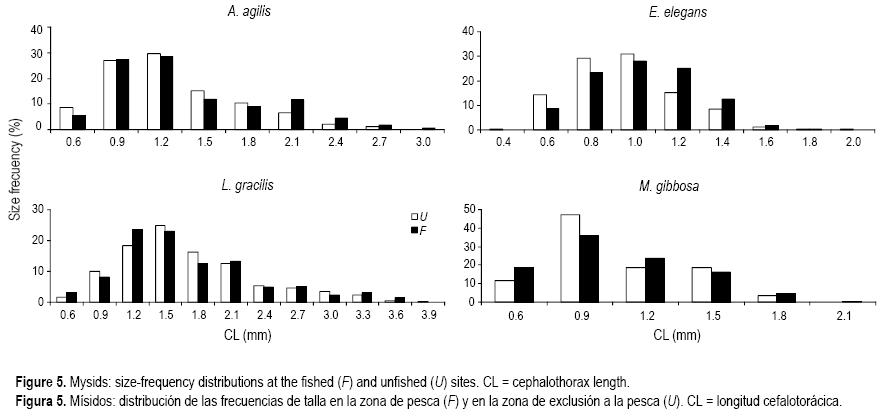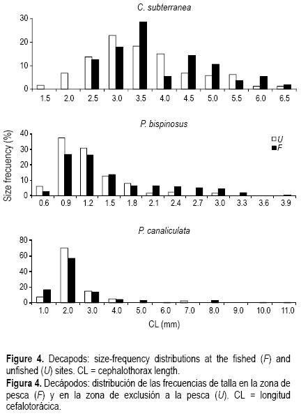 Las distribuciones de frecuencia de tallas de las especies objetivo en ambos sitios se muestran en las figuras 35 (4). No se observaron diferencias claras entre F y U en cuanto a intervalo de tallas o a distribución de frecuencias de talla; sin embargo, C. subterranea sí reveló diferencias en cuanto al intervalo de talla, con los especímenes más pequeños en U y los más grandes en F (fig. 4).
