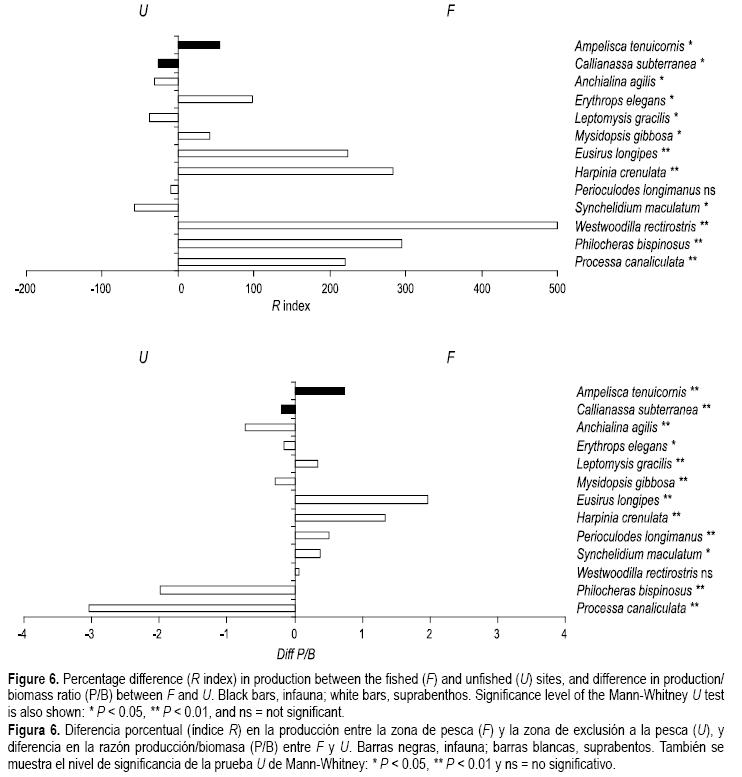 En la tabla 2 se resumen los resultados de producción y razón P/B. Ocho especies (A. tenuicornis, E. elegans, Mysidopsis gibbosa, Eusirus longipes, Harpinia crenulata, W. rectirostris, Philocheras bispinosus, Processa canaliculata) mostraron mayores valores de producción en F (fig. 6). Perioculodes longimanus no mostró diferencias significativas entre U y F, mientras que las cuatro especies restantes mostraron valores de producción más altos en U. Un número significativamente mayor de taxones mostró valores de producción más altos en F según la prueba G (G = 11.33, P < 0.001). La misma prueba indicó una tendencia significativa en los anfípodos (G = 11.16, P < 0.001): cuatro especies mostraron un mayor valor de producción en F.