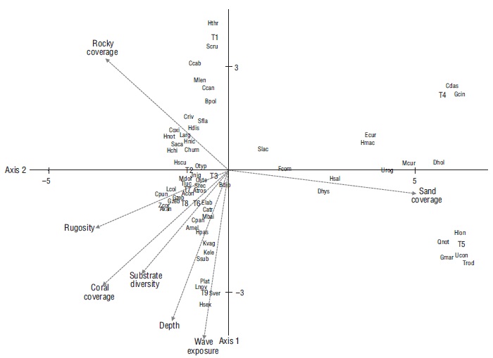 Se empleó el coeficiente de correlación de Spearman para evaluar la relación de los atributos comunitarios y la abundancia de las especies respecto a los atributos del hábitat (diversidad del sustrato, rugosidad, profundidad, grado de exposición al oleaje y proporción de roca, coral y arena). El grado de correlación entre la matriz de abundancia de especies y la matriz de características del hábitat se analizó usando la rutina RELATE (Clarke 1993) con 999 permutaciones en el paquete PRIMER v.5 (Clarke y Gorley 2006). Finalmente, se realizó un análisis canónico de correspondencias para analizar la influencia de las características del hábitat sobre las especies. Para este análisis, los atributos del hábitat se estandarizaron utilizando rangos. La significancia de los ejes canónicos y el primer eje se evaluaron mediante la prueba de Monte Carlo con 999 permutaciones. Estos análisis se realizaron con el paquete PAST v.4.05 (Hammer et al. 2001).