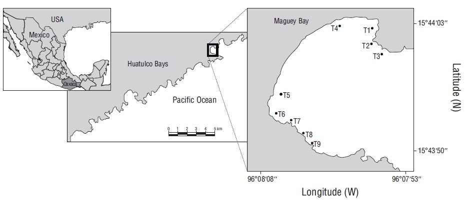 Para caracterizar la comunidad de peces de la bahía Maguey, el trabajo de campo se realizó mediante muestreos de prospección para identificar los puntos de muestreo, y se consideraron los puntos de muestreo establecidos por Juárez-Hernández et al. (2013)). Cada punto de muestreo se caracterizó mediante un transecto de 10 m de largo que se dividió en 4 partes iguales, y se obtuvo un esquema de cada cuadrante; con la conjunción de los cuadrantes, se estimó la proporción de sustratos en cada transecto. De esta forma, los transectos se identificaron de la siguiente manera: ambiente rocoso (T1), ambiente rocoso-coralino (T2), ambiente coralino-rocoso (T3), ambientes arenosos (T4 y T5), ambiente mixto (T6), ambiente coralino (T7), ambiente coralino-rocoso (T8) y ambiente rocoso-coralino (T9) (Fig. 1). La distancia promedio entre los puntos de muestreo fue de 60 m. La técnica de censos visuales fue empleada para caracterizar la ictiofauna en transectos que midieron 10 m de largo y 2.5 m de ancho y cuya profundidad mínima era de 1 m (T1, T2, T4 y T5) y la máxima de 5 m (T3 y T9). En total, se realizaron 47 transectos, los cuales se distribuyeron enero (5 transectos), mayo (9 transectos), julio (9 transectos) y septiembre (9 transectos) de 2005, y febrero (7 transectos) y mayo (8 transectos) de 2006. Al finalizar el censo de peces, en cada transecto se estimó la rugosidad, la diversidad del sustrato y el grado de exposición al oleaje. La rugosidad se estimó mediante el método propuesto por Luckhurst y Luckhurst (1978) y el método propuesto por como Cheney y Côté (2003). Para determinar la rugosidad, se utilizó una cuerda de 10 m de largo, la cual se colocó cuidadosamente sobre el sustrato siguiendo su contorno y luego se midió en longitud con una cinta métrica. La relación de la longitud total entre la longitud obtenida por el contorno proporcionó la rugosidad. La diversidad del sustrato se estimó considerando el número de elementos presentes en cada transecto (coral, roca y arena), y el grado de exposición al oleaje se categorizó acorde a la intensidad del oleaje observado (nulo, bajo, moderado, alto) (Tabla 1). De acuerdo con las características del hábitat, los transectos con proporciones de sustrato similares (hábitat coralino rocoso T2 y T9) (hábitat coralino rocoso T3 y T8) fueron tratados como unidades independientes, ya que individualmente tienen aspectos distintivos como ubicación, grado de exposición al oleaje y profundidad.