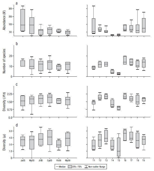 Se calculó la abundancia (N), el número de especies, la diversidad de Shannon y Wiener (1963) (Hʹn) y la diversidad acorde a Fisher et al. (1943)) (α). El análisis de estos atributos a nivel espacial y temporal se efectuó mediante el análisis de varianza (ANDEVA) de una vía o la prueba de Kruskal-Wallis, con sus respectivas pruebas de comparación múltiple (Tukey, Dunn). La pertinencia de aplicación del análisis de varianza fue determinada por el cumplimento de los supuestos de normalidad y homocedasticidad. La evaluación del grado de similitud de la ictiofauna respecto a transectos y meses se realizó mediante el índice de Bray-Curtis (Clarke y Warwick 1994). Se realizó un escalamiento multidimensional no métrico (EMNM) con el objetivo de detectar visualmente la existencia de diferencias espaciales (transectos) y temporales (meses). A la par, se efectuó un análisis de similitud (ANOSIM) para la identificación de diferencias significativas en términos de composición y abundancia íctica espaciotemporal. Si el ANOSIM denotaba diferencias significativas, se realizó un análisis de porcentaje de similitud (SIMPER) para identificar las especies responsables de la diferenciación. Estos análisis se realizaron empleando la matriz de similitud mediante el índice de Bray-Curtis, con el paquete PRIMER v.5 (Clarke y Gorley 2006).