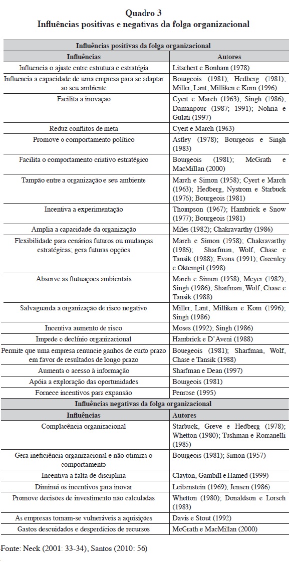 Em linha com as influências descritas, no quadro 3 apresentam-se as influências positivas e negativas relatadas na literatura. Note-se que são várias as influências da folga organizacional, com base na revisão de literatura realizada por Neck (2001), conforme citado por Santos (2010).