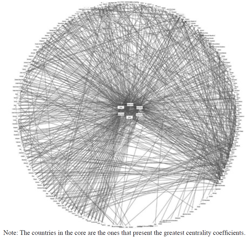 The alternative explanation under the theoretical precepts of dependency, in order to understand the dynamics of global development and the relationships between developed and developing countries, has received considerable attention from economists around the globe; with them sharing the presumption of a global system with a stratified structure (Steiber, 1979) with a core, periphery and semi-periphery (Wallerstein, 1979), with increasingly more interdependent and complex relations (Kali and Reyes, 2010). To their understanding, the traditional study of bilateral trade flows is being replaced by new analyses based on the network theory. Three classic networks stand out in international literature: random (Erdös and Rényi, 1960), scale-free (Reka and Barbási, 2002), and small-world (Watts and Strogatz, 1998). These analyze several aspects of their structural and topological properties in their non-directed, directed, binary or pondered forms. There are studies that analyze international trade relations under this perspective of networks (Wlather, 2015; De Benedictis and Tajoli, 2011; Serrano, Boguñá and Vespignani, 2007). Some of these utilize network metrics to describe their structure and complexity (Rombach, Porter, Fowler and Mucha, 2014; Barigozzi, Fagiolo and Mangioni, 2011; Bhattacharya, Mukherjee, Sar¨amaki, Kaski and Manna 2008; Mahutga, 2006; Garlaschelli and Loffredo, 2005; Serrano and Boguñá, 2003) and, by doing this, they attempt to measure the extent to which global economy has become integrated and/or evolved in time (Reyes, Schiavo and Fagiolo, 2008; Kim and Shin, 2002; Fujita, Krugman and Venables, 1999), or well, only in certain regions and/or specific sectors (Lámbarry, 2016; Amador and Cabral, 2016; Cerina, Zhu, Chessa and Riccabon, 2015; Ferrarini, 2013). Other studies consider how individual countries are conditioned by their position within the network and/or their level of centrality (Prell, Sun, Feng and Myroniuk, 2015; Mahutga, 2006), differentiating between the countries that are situated at the core and those in the periphery. The nations that are economically diversified, wealthy, powerful, and relatively independent from external control are at the core (Chirot, 1977). On the other end, peripheral nations that are the result of historic exploitation and their high dependency of core nations, are underdeveloped and in constant poverty (Richardson, 1986; Beckford, 1973).